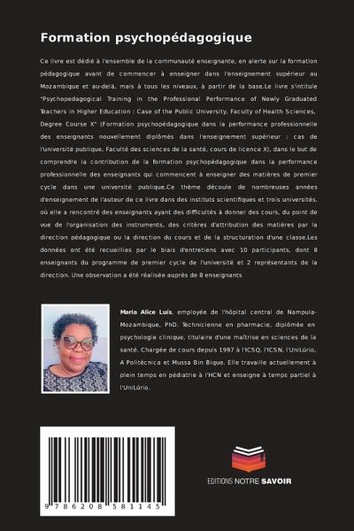 Ce livre est dédié à l'ensemble de la communauté enseignante, en alerte sur la formation pédagogique avant de commencer à enseigner dans l'enseignement supérieur au Mozambique et au-delà, mais à tous les niveaux, à partir de la base.Le livre s'intitule "Psychopedagogical Training in the Professional Performance of Newly Graduated Teachers in Higher Education : Case of the Public University, Faculty of Health Sciences, Degree Course X" (Formation psychopédagogique dans la performance professionnelle des enseignants nouvellement diplômés dans l'enseignement supérieur : cas de l'université publique, Faculté des sciences de la santé, cours de licence X), dans le but de comprendre la contribution de la formation psychopédagogique dans la performance professionnelle des enseignants qui commencent à enseigner des matières de premier cycle dans une université publique.Ce thème découle de nombreuses années d'enseignement de l'auteur de ce livre dans des instituts scientifiques et trois universités, où elle a rencontré des enseignants ayant des difficultés à donner des cours, du point de vue de l'organisation des instruments, des critères d'attribution des matières par la direction pédagogique ou la direction du cours et de la structuration d'une classe.Les données ont été recueillies par le biais d'entretiens avec 10 participants, dont 8 enseignants du programme de premier cycle de l'université et 2 représentants de la direction. Une observation a été réalisée auprès de 8 enseignants