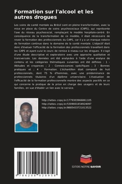 Les soins de santé mentale au Brésil sont en pleine transformation, avec la mise en place du Centre de soins psychosociaux (CAPS), qui représente l'axe du réseau psychosocial, remplaçant le modèle hospitalo-centré. En conséquence de la transformation de ce modèle, il était nécessaire de revoir la formation des professionnels du CAPS, car il y a un manque notoire de formation continue dans le domaine de la santé mentale. L'objectif était donc d'évaluer l'efficacité de la formation des professionnels travaillant dans les CAPS et ayant suivi le cours de remise à niveau sur les drogues. Il s'agit d'une étude descriptive et exploratoire avec une approche qualitative et transversale. Les données ont été analysées à l'aide d'une analyse de contenu et les catégories thématiques suivantes ont été définies : 1 - Attitudes et croyances ; 2 - Connaissances spécifiques ; 3 - Bonnes pratiques et ; 4 - Formation. L'échantillon était composé de huit professionnels, dont 75 % d'hommes, avec une prédominance de professionnels titulaires d'un diplôme universitaire. L'évaluation de l'efficacité de la formation professionnelle montre des aspects positifs en ce qui concerne la pratique de la prise en charge des usagers et de leurs familles, en vue d'établir un lien avec le service.