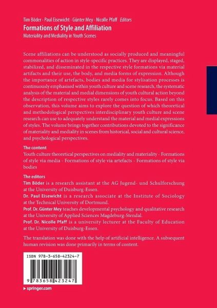 Scene affiliations can be understood as socially produced and meaningful commonalities of action in style-specific practices. They are displayed, staged, stabilized, and disseminated in the respective style formations via material artifacts and their use, the body, and media forms of expression. Although the importance of artefacts, bodies and media for stylisation processes is continuously emphasised within youth culture and scene research, the systematic analysis of the material and medial dimensions of youth cultural action beyond the description of respective styles rarely comes into focus. Based on this observation, this volume aims to explore the question of which theoretical and methodological perspectives interdisciplinary youth culture and scene research can use to adequately understand the material and medial expressions of styles. The volume brings together contributions devoted to the significance of materiality and mediality in scenes from historical, social and cultural science, and psychological perspectives.