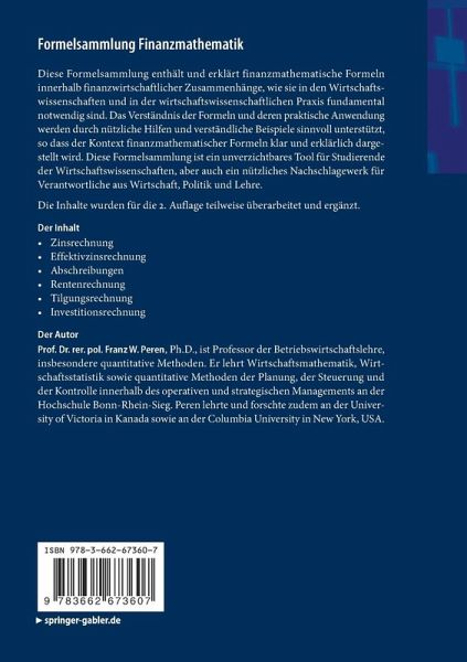 Diese Formelsammlung enthält und erklärt finanzmathematische Formeln innerhalb finanzwirtschaftlicher Zusammenhänge, wie sie in den Wirtschaftswissenschaften und in der wirtschaftswissenschaftlichen Praxis fundamental notwendig sind. Das Verständnis der Formeln und deren praktische Anwendung werden durch nützliche Hilfen und verständliche Beispiele sinnvoll unterstützt, so dass der Kontext finanzmathematischer Formeln klar und erklärlich dargestellt wird. Diese Formelsammlung ist ein unverzichtbares Tool für Studierende der Wirtschaftswissenschaften, aber auch ein nützliches Nachschlagewerk für Verantwortliche aus Wirtschaft, Politik und Lehre.