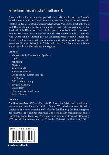 Diese etablierte Formelsammlung enthält und erklärt mathematische Formeln innerhalb ökonomischer Zusammenhänge, wie sie in den Wirtschaftswissenschaften und in der wirtschaftswissenschaftlichen Praxis unbedingt notwendig sind. Das Verständnis der Formeln und deren praktische Anwendung werden durch nützliche Hilfen und erklärliche Beispiele sinnvoll unterstützt, so dass der Kontext wirtschaftsmathematischer Formeln klar und verständlich dargestellt wird. Diese Formelsammlung ist ein unverzichtbares Tool für Studierende der Wirtschaftswissenschaften, aber auch ein nützliches Nachschlagewerk für Verantwortliche aus Wirtschaft, Politik und Lehre. Die Inhalte wurden für die 6. Auflage teilweise überarbeitet und ergänzt.