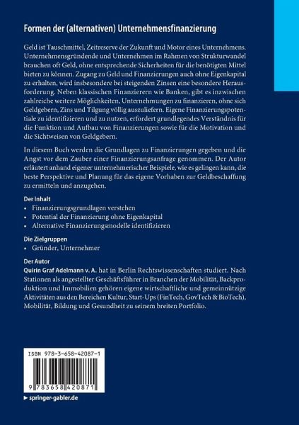 Geld ist Tauschmittel, Zeitreserve der Zukunft und Motor eines Unternehmens. Unternehmensgründende und Unternehmen im Rahmen von Strukturwandel brauchen oft Geld, ohne entsprechende Sicherheiten für die benötigten Mittel bieten zu können. Zugang zu Geld und Finanzierungen auch ohne Eigenkapital zu erhalten, wird insbesondere bei steigenden Zinsen eine besondere Herausforderung. Neben klassischen Finanzierern wie Banken, gibt es inzwischen zahlreiche weitere Möglichkeiten, Unternehmungen zu finanzieren, ohne sich Geldgebern, Zins und Tilgung völlig auszuliefern. Eigene Finanzierungspotentiale zu identifizieren und zu nutzen, erfordert grundlegendes Verständnis für die Funktion und Aufbau von Finanzierungen sowie für die Motivation und die Sichtweisen von Geldgebern.In diesem Buch werden die Grundlagen zu Finanzierungen gegeben und die Angst vor dem Zauber einer Finanzierungsanfrage genommen. Der Autor erläutert anhand eigener unternehmerischer Beispiele, wie es gelingen kann,die beste Perspektive und Planung für das eigene Vorhaben zur Geldbeschaffung zu ermitteln und anzugehen.