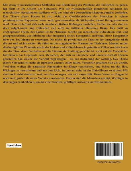Mit streng wissenschaftlichen Methoden eine Darstellung der Probleme des Erotischen zu geben, lag nicht in der Absicht des Verfassers. Wer die wissenschaftlich geordneten Tatsachen des menschlichen Sexuallebens studieren will, der wird eine vortreffliche Literatur darüber vorfinden. Das Thema dieses Buches ist also nicht das Geschlechtsleben des Menschen in seinen physiologischen Rapporten, wenn auch, gewissermaßen als Stichprobe, darauf Bezug genommen wird. Denn so luftzart sich auch manche erotischen Bildungen darstellen, bleiben sie oder sind sie doch erdgebunden und vollziehen sich nicht im luftleeren blutleeren Raum. Das nicht zu erschöpfende Thema des Buches ist die Phantasie, welche das menschliche Individuum, zeit- und gruppenbestimmt, zur Erhaltung oder Steigerung seines Lustgefühls aufbringt, diese Lustgefühle über den Tod hinaus zu verewigen. Die nichts als physiologische Tatsache der Lustgefühle erhält die Art und nichts weiter. Sie führt zu den stagnierenden Formen des Tierlebens. Mangel an der diesbezüglichen Phantasie macht das Liebes- und Kulturleben echt primitiver Völker so einfach wie das der Tiere, deren Verhalten auf die Einform der Gattung gerichtet ist, nicht auf die Varietät der Individuen. Im Gegensatz zum Menschen, der sich in Einzelehe und Einzelwirtschaft Formen geschaffen hat, welche die Varietät begünstigen ¿ bis zur Bedrohung der Gattung. Das Thema dieses Versuches ist mehr als irgendein anderes voller Fallen. Vorurteile gebärden sich als Urteile, Vorlieben wollen die natürliche Perspektive der Dinge verschieben, und Scheu tut das ihre, Wichtiges zu verschleiern und aus dem Licht, in dem es steht, in ein Clair-Obscur zu rücken. Wir sind noch nicht einmal so weit, nur das zu sagen, was sich sagen läßt. Unser Vorrat an Fragen ist noch weit größer als unser Vorrat an Antworten. Darum sind die Menschen geneigt, Wichtiges in den Fragen zu überhören, um mit einer bereiten, gefälligen Antwort zurechtzukommen.