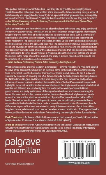 'What do Presidents and Prime Ministers do after they leave office? Do they enjoy continued influence, or just fade away? Theakston and de Vries' collection brings together a formidable range of experts in the field of leadership studies to examine this issue. Such a synthesis of analyses is as welcome as it is necessary, for political leadership studies are scattered and under-researched. The book is rich in anecdotes, and tells us too of the personalities involved, the dedication as well as the egos, and their role. The book is comprehensive in its comparative scope and coverage of constitutional and conventional frameworks, and the political cultures that prevail in the wide range of countries studied; so much so, that this penetrating focus on what politicians do 'after power' tells us a great deal about the nature of politics and power themselves in the range of countries studied ... The study is a much-needed contribution to the theorisation of comparative political leadership.'