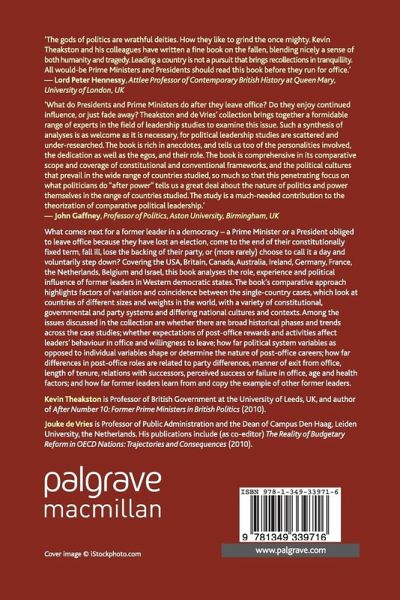 'What do Presidents and Prime Ministers do after they leave office? Do they enjoy continued influence, or just fade away? Theakston and de Vries' collection brings together a formidable range of experts in the field of leadership studies to examine this issue. Such a synthesis of analyses is as welcome as it is necessary, for political leadership studies are scattered and under-researched. The book is rich in anecdotes, and tells us too of the personalities involved, the dedication as well as the egos, and their role. The book is comprehensive in its comparative scope and coverage of constitutional and conventional frameworks, and the political cultures that prevail in the wide range of countries studied; so much so, that this penetrating focus on what politicians do 'after power' tells us a great deal about the nature of politics and power themselves in the range of countries studied ... The study is a much-needed contribution to the theorisation of comparative political leadership.'
