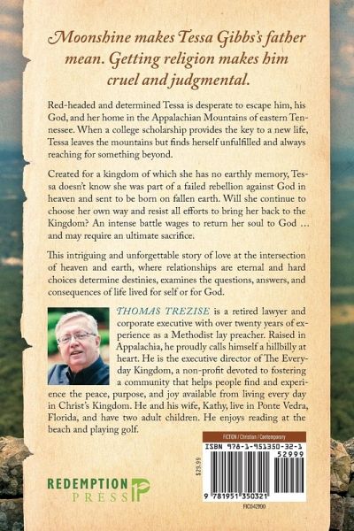 Moonshine makes Tessa Gibbs's father mean, and getting religion makes him cruel and judgmental. Red-headed and determined Tessa is desperate to escape him, his God, and her home in the Appalachian Mountains of eastern Tennessee. When a college scholarship provides the key to a new life, Tessa leaves the mountains but finds herself unfulfilled and always reaching for something beyond. Created for a kingdom of which she has no earthly memory, Tessa doesn't know she was part of a failed rebellion against God in heaven and sent to be born on fallen earth. Will she continue to choose her own way and resist all efforts to bring her back to the Kingdom? An intense battle wages to return her soul to God ... and may require an ultimate sacrifice. This intriguing and unforgettable story of love at the intersection of heaven and earth, where relationships are eternal and hard choices determine destinies, examines the questions, answers, and consequences of life lived for self or for God.