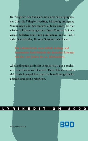 Der Vergleich des Künstlers mit einem Seismographen, der über die Fähigkeit verfügt, frühzeitig und genau Stimmungen und Bewegungen aufzuzeichnen, sei hier wieder in Erinnerung gerufen. Denn Thomas Krämers Zeiger arbeiten exakt und punktgenau und er findet dabei Sprachbilder, die kein Gramm zu viel haben.