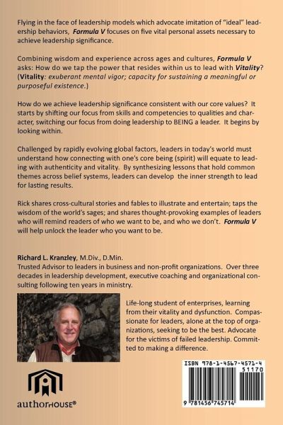 Flying in the face of current leadership models which advocate imitation of "ideal" behaviors, Formula V focuses on leadership vitality, that force which moves us from being externally manipulated to being internally directed toward leadership success. In a model which combines wisdom and experience across ages and cultures, Formula V asks: How do we tap the ability that resides in each of us to lead with Vitality (exuberant mental vigor; capacity for a meaningful or purposeful existence)? How do we move from mimicry of others to transforming ourselves? It starts with changing our definition of leadership. We need to shift our distinctions and assessments from skills and competencies to qualities and character. We could all benefit from switching our focus from doing leadership to BEING a leader. Based on in-depth experience in coaching organizational leaders for 30 years across diverse industries, Kranzley guides the reader through a model based on five (or V) Qualities or Virtues: Courage, Humility, Honesty, Resonance, and Altruism. By honing one's leadership character to incorporate these into authentic behavior, a leader can grow into leadership with lasting significance. Are these qualities learned or are they innate? Leadership is like poetry. You can improve language skills, build vocabulary, and learn about rhythm and rhyme. In that way one enables those inner poets to shine, ONLY IF there is a poet already inside. Formula V will help you assess your areas of need and of power. In our world today, we are challenged by an increasingly uncertain and rapidly evolving global economy where leadership is affected by not only the values of national cultures, but also the belief systems and paradigms of the world's varying religious traditions. It becomes paramount for a leader in today's world to understand how connecting with the core of one's being (spirit) will equate to leading with vitality. Rick shares cross-cultural stories and fables to illustrate and entertain (The Cow and the Pig, The Three Blind Men, Arachne, Student of Athena); taps the insight and wisdom of some of the world's sages (Aristotle, Lao-Tzu, Rabbi Jonathan Sacks, Ted Collins, Nelson Mandela); and shares thought-provoking examples of leaders who will remind readers of who we want to be, and who we don't. Formula V will help unlock the leader who you want to be.