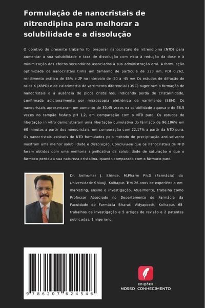 O objetivo do presente trabalho foi preparar nanocristais de nitrendipina (NTD) para aumentar a sua solubilidade e taxa de dissolução com vista à redução da dose e à minimização dos efeitos secundários associados à sua administração oral. A formulação optimizada de nanocristais tinha um tamanho de partícula de 335 nm, PDI 0,262, rendimento prático de 85% e ZP no intervalo de -20 a -45 mv. Os estudos de difração de raios X (XRPD) e de calorimetria de varrimento diferencial (DSC) sugeriram a formação de nanocristais e a ausência de picos cristalinos, indicando perda de cristalinidade, confirmada adicionalmente por microscopia eletrónica de varrimento (SEM). Os nanocristais apresentaram um aumento de 30,45 vezes na solubilidade aquosa e de 38,5 vezes no tampão fosfato pH 1,2, em comparação com o NTD puro. Os estudos de libertação in vitro demonstraram uma libertação cumulativa do fármaco de 96,186% em 60 minutos a partir dos nanocristais, em comparação com 22,17% a partir da NTD pura. Os nanocristais estáveis de NTD formulados pelo método de precipitação anti-solvente mostram uma melhor solubilidade e dissolução. Concluiu-se que os nanocristais de NTD foram obtidos com uma melhoria significativa da solubilidade de saturação e que o fármaco perdeu a sua natureza cristalina, quando comparado com o fármaco puro.
