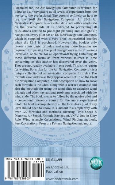 Formulas for the Air Navigation Computer is written for pilots and air navigators at all levels of experience from the novice to the professional. The book is self-help on how to use the E6-B Air Navigation Computer. An E6-B Air Navigation Computer is a circular slide rule with a wind slide on the reverse side. It is dedicated to performing all calculations related to pre-flight planning and in-flight air navigation. Every pilot has an E6-B Air Navigation Computer, which is supplied with a very brief instructional booklet when the E6-B is purchased. However, the booklet only covers a few basic formulas, and many more formulas are required for passing the pilot navigation exams at various levels and, of course, for all operational flying. Obtaining all these different formulas from various sources is time consuming, as this author has discovered over the years. They are not readily available in one book. This is the reason for writing Formulas for the Air Navigation Computer; it is a unique collection of air navigation computer formulas. The formulas are written as they appear when set up on the E6-B Air Navigation Computer. A full description on how to solve each formula is included, along with a worked example and also the methods for using the wind slide to calculate wind triangle and other navigational problems associated with the wind slide. The book is easy to follow by the novice pilot and a convenient reference source for the more experienced pilot. The book is complete with all the formulas a pilot of any level should need to know. It is laid out in a simple way with over 122 formulas and methods, covering Time, Speed & Distance, Air Speed, Altitude Navigation, VNAV, One-in-Sixty Rule, Wind triangle Calculations, Wind Finding methods, Fuel Calculations, Pressure Pattern Navigation and more.