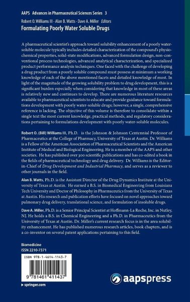 Route-Specific Challenges in Delivery of Poorly Water Soluble Drugs.- Optimizing the Formulation of Poorly Water Soluble Drugs.- Solid-State Techniques for Improving Solubility.- Mechanical Particle Size Reduction Techniques.- Solubilized Formulations.- Injectable Formulations of Poorly Water Soluble Drugs.- Design and Development of Self-Emulsifying Lipid Formulations for Improving Oral Bioavailability of Poorly Water-Soluble and Lipophilic Drugs.- Structured Development Approach for Amorphous Systems.- Melt Extrusion.- Spray Drying Technology.- Pharmaceutical Cryogenic Technologies.- Precipitation Technologies for Nanoparticle Production.- Emerging Technologies to Increase the Bioavailability of Poorly Water Soluble Drugs.- Regulatory Considerations for Development and Commercialization of Poorly Water Soluble Drugs.