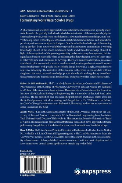 This volume is intended to provide the reader with a breadth of understanding regarding the many challenges faced with the formulation of poorly water-soluble drugs as well as in-depth knowledge in the critical areas of development with these compounds. Further, this book is designed to provide practical guidance for overcoming formulation challenges toward the end goal of improving drug therapies with poorly water-soluble drugs. Enhancing solubility via formulation intervention is a unique opportunity in which formulation scientists can enable drug therapies by creating viable medicines from seemingly undeliverable molecules. With the ever increasing number of poorly water-soluble compounds entering development, the role of the formulation scientist is growing in importance. Also, knowledge of the advanced analytical, formulation, and process technologies as well as specific regulatory considerations related to the formulation of these compounds is increasing in value. Ideally, this book will serve as a useful tool in the education of current and future generations of scientists, and in this context contribute toward providing patients with new and better medicines.