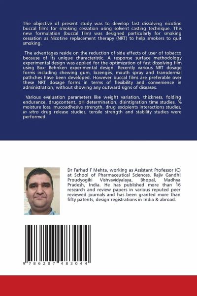 The objective of present study was to develop fast dissolving nicotine buccal films for smoking cessation using solvent casting technique. This new formulation (buccal film) was designed particularly for smoking cessation as Nicotine replacement therapy (NRT) to help smokers to quit smoking. The advantages reside on the reduction of side effects of user of tobacco because of its unique characteristic. A response surface methodology experimental design was applied for the optimization of fast dissolving film using Box- Behnken experimental design. Recently various NRT dosage forms including chewing gum, lozenges, mouth spray and transdermal pathches have been developed. However buccal films are preferable over these NRT dosage forms in terms of flexibility and convenience in administration, without showing any outward signs of diseases. Various evaluation parameters like weight variation, thickness, folding endurance, drugcontent, pH determination, disintigration time studies, % moisture loss, mucoadhesive strength, drug excipients interactions studies, in vitro drug release studies, tensile strength and stability studies were performed.