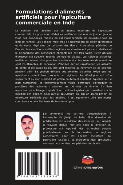 La nutrition des abeilles est un aspect important de l'apiculture commerciale. La population d'abeilles mellifères diminue de jour en jour et l'une des principales raisons en est l'indisponibilité de nourriture tout au long de l'année. Les abeilles mellifères se nourrissent de pollen (protéines) et de nectar (hydrates de carbone) des fleurs. À certaines périodes de l'année, les conditions météorologiques ne conviennent pas aux abeilles et la disponibilité des ressources alimentaires est très faible. Cette période d'urgence est souvent appelée période de disette. Les colonies d'abeilles mellifères doivent lutter pour leur existence et si les réserves de nourriture sont insuffisantes, la population d'abeilles décline rapidement, les activités de ponte et d'élevage du couvain sont réduites au minimum et les colonies peuvent périr. La gestion efficace des colonies d'abeilles exige que les apiculteurs soient très prudents et vigilants. Le développement d'un supplément ou d'un substitut de pollen hautement appétent, équilibré sur le plan nutritionnel et économiquement viable permettra d'éradiquer le problème des apiculteurs pendant les périodes de disette. Ce livre apportera un éclairage important aux entomologistes qui travaillent sur la nutrition des abeilles ainsi qu'aux apiculteurs qui ont un grand besoin de nourriture artificielle pour les abeilles. Il est également utile aux jeunes chercheurs et aux étudiants de troisième cycle.