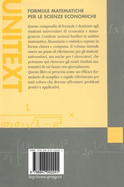 Questo compendio di formule è stato raccolto per gli studenti di economia e management delle università e per i ricercatori. Contiene nozioni basilari in ambito matematico, finanziario e statistico in forma chiara e compatta. Questo volume intende essere un punto di riferimento per gli studenti universitari, da associare ai libri testo, e per i professionisti, che potranno qui trovare gli esatti risultati matematici di cui fanno giornalmente uso. Le persone che gestiscono problemi pratici e applicativi potranno utilizzare questo libro come un efficace formulario di semplice e rapido riferimento.