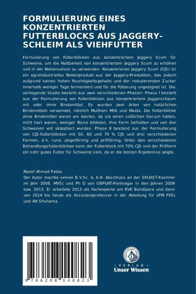 Formulierung von Futterblöcken aus konzentriertem Jaggery Scum für Schweine, um die Haltbarkeit von konzentriertem Jaggery Scum zu erhöhen und in der Nebensaison zu verwenden. Konzentrierter Jaggery Scum (CJS) ist ein agroindustrielles Nebenprodukt aus der Jaggery-Produktion, das jedoch aufgrund seines hohen Feuchtigkeitsgehalts und der reduzierenden Zucker innerhalb weniger Tage fermentiert und für die Fütterung ungeeignet ist. Die vorliegende Studie besteht aus zwei verschiedenen Phasen: Phase besteht aus der Formulierung von Futterblöcken aus konzentriertem Jaggerschaum mit oder ohne Bindemittel. Es wurden zwei Arten von natürlichen Bindemitteln verwendet, nämlich Multhani Mitti und Maida. Die Futterblöcke ohne Bindemittel waren am besten, da sie einen süßlichen Geruch hatten, nicht hart waren, weniger Risse bildeten, ihre Form behielten und von den Schweinen voll akzeptiert wurden. Phase bestand aus der Formulierung von CJS-Futterblöcken mit 50, 60 und 70 % CJS und drei verschiedenen Formen, d.h. rund, ziegelförmig und prillförmig. Unter den verschiedenen Behandlungsfutterblöcken kann der Futterblock mit 70% CJS und der Prillform ein sehr gutes Futter für Schweine sein, da er die besten Ergebnisse zeigte.