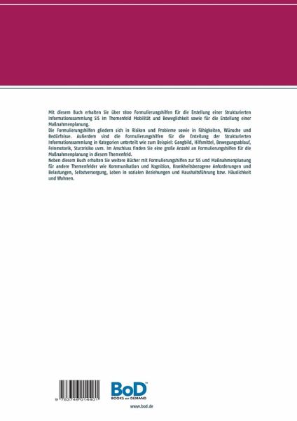 Mit diesem Buch erhalten Sie über 1800 Formulierungshilfen für die Erstellung einer Strukturierten Informationssammlung SIS im Themenfeld Mobilität und Beweglichkeit sowie für die Erstellung einer Maßnahmenplanung.Die Formulierungshilfen gliedern sich in Risiken und Probleme sowie in Fähigkeiten, Wünsche und Bedürfnisse. Außerdem sind die Formulierungshilfen für die Erstellung der Strukturierten Informationssammlung in Kategorien unterteilt wie zum Beispiel: Gangbild, Hilfsmittel, Bewegungsablauf, Feinmotorik, Sturzrisiko u.v.m. Im Anschluss finden Sie eine große Anzahl an Formulierungshilfen für die Maßnahmenplanung in diesem Themenfeld.Neben diesem Buch erhalten Sie weitere Bücher mit Formulierungshilfen zur SIS und Maßnahmenplanung für andere Themenfelder wie Kommunikation und Kognition, Krankheitsbezogene Anforderungen und Belastungen, Selbstversorgung, Leben in sozialen Beziehungen und Haushaltsführung bzw. Häuslichkeit und Wohnen.