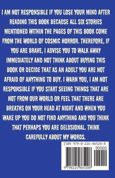I am not responsible if you lose your mind after reading this book because all six stories mentioned within the pages of this book come from the world of cosmic horror. Therefore, if you are brave, I advise you to walk away immediately and not think about buying this book or decide that as an adult you are not afraid of anything to buy. I warn you, I am not responsible if you start seeing things that are not from our world or feel that there are breaths on your head at night and when you wake up you do not find anything and you think that perhaps you are delusional. Think carefully about my words.