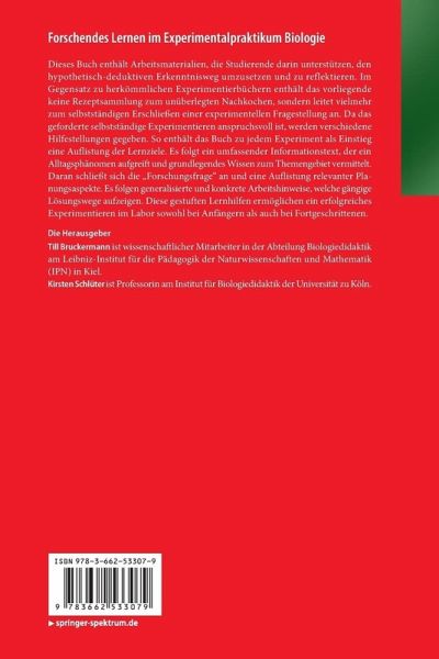 Dieses Buch enthält Arbeitsmaterialien, die Studierende darin unterstützen, den hypothetisch-deduktiven Erkenntnisweg umzusetzen und zu reflektieren. Im Gegensatz zu herkömmlichen Experimentierbüchern enthält das vorliegende keine Rezeptsammlung zum unüberlegten Nachkochen, sondern leitet vielmehr zum selbstständigen Erschließen einer experimentellen Fragestellung an. Da das geforderte selbstständige Experimentieren anspruchsvoll ist, werden verschiedene Hilfestellungen gegeben. So enthält das Buch zu jedem Experiment als Einstieg eine Auflistung der Lernziele. Es folgt ein umfassender Informationstext, der ein Alltagsphänomen aufgreift und grundlegendes Wissen zum Themengebiet vermittelt. Daran schließt sich die "Forschungsfrage" an und eine Auflistung relevanter Planungsaspekte. Es folgen generalisierte und konkrete Arbeitshinweise, welche gängige Lösungswege aufzeigen. Diese gestuften Lernhilfen ermöglichen ein erfolgreiches Experimentieren im Labor sowohl bei Anfängern als auchbei Fortgeschrittenen.