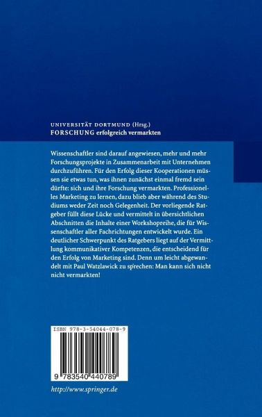 Wissenschaftler sind darauf angewiesen, mehr und mehr Forschungsprojekte in Zusammenarbeit mit Unternehmen durchzuführen. Für den Erfolg dieser Kooperationen müssen sie etwas tun, was ihnen zunächst einmal fremd sein dürfte: sich und ihre Forschung vermarkten. Professionelles Marketing zu lernen, dazu blieb aber während des Studiums weder Zeit noch Gelegenheit. Der vorliegende Ratgeber füllt diese Lücke und vermittelt in übersichtlichen Abschnitten die Inhalte einer Workshopreihe, die für Wissenschaftler aller Fachrichtungen entwickelt wurde.