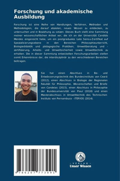 Forschung ist eine Reihe von Handlungen, Verfahren, Methoden und Methodologien, die darauf abzielen, neues Wissen zu entdecken, zu untersuchen und in Beziehung zu setzen. Dieses Buch stellt eine Sammlung meiner wissenschaftlichen Artikel vor, die ich an der Universität Candido Mendes eingereicht habe, um ein postgraduales Lato Sensu-Zertifikat auf Spezialisierungsebene in den Bereichen Philosophieunterricht, Biologiedidaktik und pädagogische Praktiken, Umweltberatung und -zertifizierung, Arbeits- und Umweltsicherheit sowie Umwelttechnik zu erhalten. Die in dieser Sammlung entwickelten Forschungsarbeiten stellen somit Erkenntnisse dar, die interdisziplinär zu den verschiedenen Bereichen beitragen.