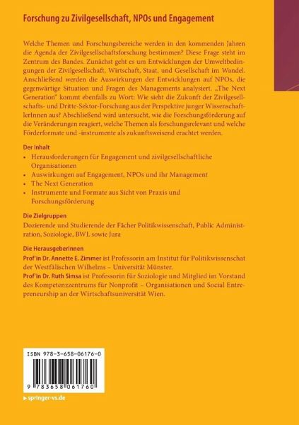 Welche Themen und Forschungsbereiche werden in den kommenden Jahren die Agenda der Zivilgesellschaftsforschung bestimmen? Diese Frage steht im Zentrum des Bandes. Zunächst geht es um Entwicklungen der Umweltbedingungen der Zivilgesellschaft, Wirtschaft, Staat, und Gesellschaft im Wandel. Anschließend werden die Auswirkungen der Entwicklungen auf NPOs, die gegenwärtige Situation und Fragen des Managements analysiert. "The Next Generation" kommt ebenfalls zu Wort: Wie sieht die Zukunft der Zivilgesellschafts- und Dritte-Sektor-Forschung aus der Perspektive junger WissenschaftlerInnen aus? Abschließend wird untersucht, wie die Forschungsförderung auf die Veränderungen reagiert, welche Themen als forschungsrelevant und welche Förderformate und -instrumente als zukunftsweisend erachtet werden.