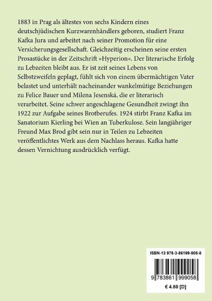 1883 in Prag als ältestes von sechs Kindern eines deutschjüdischen Kurzwarenhändlers geboren, studiert Franz Kafka Jura und arbeitet nach seiner Promotion für eine Versicherungsgesellschaft. Gleichzeitig erscheinen seine ersten Prosastücke in der Zeitschrift "Hyperion". Der literarische Erfolg zu Lebzeiten bleibt aus. Er ist zeit seines Lebens von Selbstzweifeln geplagt, fühlt sich von einemübermächtigen Vater belastet und unterhält nacheinander wankelmütige Beziehungen zu Felice Bauer und Milena Jesenská, die er literarisch verarbeitet. Seine schwer angeschlagene Gesundheit zwingt ihn 1922 zur Aufgabe seines Brotberufes. 1924 stirbt Franz Kafka im Sanatorium Kierling bei Wien an Tuberkulose. Sein langjähriger Freund Max Brod gibt sein nur in Teilen zu Lebzeiten veröffentlichtes Werk aus dem Nachlass heraus. Kafka hatte dessen Vernichtung ausdrücklich verfügt.