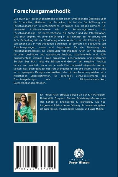 Das Buch zur Forschungsmethodik bietet einen umfassenden Überblick über die Grundsätze, Methoden und Techniken, die bei der Durchführung von Forschungsarbeiten in verschiedenen Disziplinen zum Tragen kommen. Es behandelt Schlüsselthemen wie den Forschungsprozess, das Forschungsdesign, die Datenerhebung, die Analyse und die Interpretation. Das Buch beginnt mit einer Einführung in das Konzept der Forschung und ihrer Bedeutung für die Gewinnung neuen Wissens und die Förderung des Verständnisses in verschiedenen Bereichen. Es erörtert die Bedeutung von Forschungsfragen, -zielen und -hypothesen für die Steuerung des Forschungsprozesses. Es untersucht verschiedene Arten von Forschung, darunter qualitative und quantitative Ansätze, experimentelle und nicht-experimentelle Designs sowie explorative, beschreibende und erklärende Studien. Das Buch hebt die Stärken und Grenzen der einzelnen Ansätze hervor und erörtert, wann sie je nach Forschungsziel eingesetzt werden sollten. Das Buch geht auf das Forschungsdesign ein und betont, wie wichtig es ist, geeignete Designs auszuwählen, die mit den Forschungszielen und -hypothesen übereinstimmen. Es behandelt Schlüsselelemente des Forschungsdesigns, wie z. B. Stichprobentechniken, Datenerhebungsmethoden.