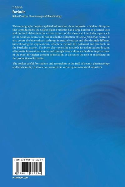 This monograph compiles updated information about forskolin, a labdane diterpene that is produced by the Coleus plant. Forskolin has a large number of practical uses and the book delves into the various aspects of this chemical. It includes topics such as the botanical source of forskolin and the cultivation of Coleus forskohlii, source. It also covers the biosynthetic pathways in natural sources and also through different biotechnological applications. Chapters include the potential and products in the Forskolin market. The book also covers the methods for enhanced production of forskolin from natural sources and through tissue culture methods for improvement of the plant for higher content of forskolin. It discusses the role of endophytes in the production of forskolin.