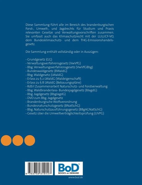 Diese Sammlung führt alle im Bereich des brandenburgischen Forst-, Umwelt-, und Jagdrechts für Studium und Praxis relevanten Gesetze und Verwaltungsvorschriften zusammen. Dies umfasst auch das Klimaschutzrecht mit LULUCF-VO, Bundesklimaschutzgesetz sowie das THG-Emissionshandelsgesetz. Die Sammlung enthält vollständig oder in Auszügen: - Grundgesetz (GG)- Verwaltungsverfahrensgesetz (VwVfG)- Bbg. Verwaltungsverfahrensgesetz (VwVfGBbg)- Bundeswaldgesetz (BWaldG)- Bbg. Waldgesetz (LWaldG)- Erlass zu § 2 LWaldG (Waldeigenschaft)- Erlass zu § 8 LWaldG (Bebauungspläne)- Runderlass Zusammenarbeit Naturschutz- und Forstverwaltung- Bbg. Waldbranderlass- Bundesjagdgesetz (BJagdG)- Bbg. Jagdgesetz (BbgJagdG)- DVO zum Bbg. Jagdgesetz - Brandenburgische Wolfsverordnung- Bundesnaturschutzgesetz (BNatSchG)- Bbg. Naturschutzausführungsgesetz (BBgAGNatSchG)- Gesetz über die Umweltverträglichkeitsprüfung (UVPG)