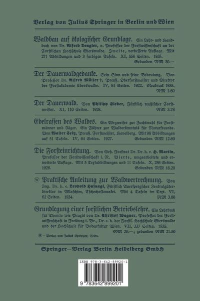 1. Das metrische Maß- und Gewichtssystem.- 2. Alte Maße und Gewichte.- 3. Försterbestallung aus dem Jahre 1682.- 4. Die Prozentrechnung.- Allgemeine Einführung des Prozentbegriffes und Übungsbeispiele.- Forstliche Prozentbegriffe.- Feuer-, Vieh-, Haftpflichtwersicherung. Grunderwerbs- und Wertzuwachssteuern.- 5. Richtiges Rechnen durch richtiges Schließen!.- 6. Allgemeine Prozentaufgaben.- Krankenkassenbeiträge.- Haumeistergebühr.- Akkordzuschläge.- Soziallastenanteile.- Abschlags-, Vorschußzahlungen.- Umsatzsteuer.- 7. Der Holzverkauf.- Holzgelder und Lare.- Das Ungelb.- Die Verkaufspreise in Prozenten der Lare.- Die Durchschnittstare bie Submissionslosen.- Durchschnittstare und klassenweiser Verkauf.- Holzgelb und allgemeiner Zahlungstag (UZL).- Die Holzaufmaßliste.- Die Aufmessung ohne Rinde.- (Papier) holzverkauf vor dem Einschlag.- Abhängigkeit des Schwellenholz-Waldpreises vom Marktpreis des Schwellen.- Rundholzpreis und Schnittholzpreis.- Grubenstempelholz berechnet nach Lehnpfuhl,.- Vorteilhaftere Aushaltung des Holzes.- Mittendurchnesser und Holzpreis.- 8. Rabatt und Skonto im praktischen Leben.- Rabattgewährung bei der Pr. Staatsforsverwaltung.- 9. Zinsrechnung.- Allgemeine Begriffe.- Zinsen, Kapital, Prozentsatz, Zeit warden fesucht.- Kapitalwert von Berechtigungen.- Bankmäßige Zinsechnung.- Ein Kontoauszug.- Zinseszinsen.- Stundungs- und Verzugszinsen bei Holzgeldern.- 10. Zahlen aus der Statistik.- I. Unser deutsches Vaterland.- Lage, Grenzen, höchste Berge, Flüsse, Seen.- Gebiet und Bevölkerung.- Was wir durch Versailles verloren.- Wachstum der deutschen Bevölkerung.- Berufsgliederung.- Bodenbenutzung, Waldanteile.- Vordringen der Nadelhölzer.- Holzartenverbreitung.- Vesitzverhältnisse bei der Waldfläche.- Durchschnitts- undGesamterträge.- Beamte und Arbeiter.- Heimische Holzerzeugung.- Jahresholzbedarf, Einfuhr.- II. Das Forstamt Spangenberg.- Größe, Flächenverteilung.- Holzartenanteil.- Vorratsnachweisung für Buche.- Hauerlohnstatistik.- Einschlangs- und Reinertragsnachweisung.- Kulturgelder.- Jahresetat.- 11. Der Hauungsbetrieb.- Derbholz, Rutzholz, Sortimentsprozente.- Stundendurchschnittsverdienste.- Titelblatt des Rummerbuches.- Werbungskoftenberechnungen.- Reingewinn (erntektostenfreier Ertrag).- Hauungsleiftungen.- Abgabe an Selbftwerber.- Grubenholz, Stockholz, Langholz und Schichtholzaufarbeitung.- 12. Die Sozialversicherungen.- 1. Die Krankenverficherung und der Krankengeldzuschutz.- 2. Die Unfallverficherung.- 3. Die Invalidenverficherung.- 4. Die Arbeits-verficherung.- 5. Die Angestelltenverfichrung.- 13. Die Flächenberechnung.- I. Die Flächenfiguren.- A. Die Dreiecke.- B. Die Bierecke.- C. Die Bielecke.- D. Der Kreis.- II. Das Ausziehen der Ouadratwurzel.- III. Berechnung der Flächenfiguren.- A. Barallelogramme.- B. Der Ouadrat- und Rechtecksverband.- C. Die Dreiecke.- 1. Allgemeines.- 2. Der Bythagoreifche Lehrsatz und das rechtwinklige Dreieck.- 3. Das gleichseitige Dreick und der Dreiecksverband.- 4. Das gleichschenklige Dreick.- 5. Das undleichseitige Dreick.- D. Das Trapez.- E. Trapezoide und Bielecke.- F. Kreis, Kreisausschnitte und -abschnitte.- 14. Das Rechnen mit Proportionen.- Der Strahlensatz mit Anwendung.- Gesellschafts- und Tailungs-rechnung.- Breisfchientzen,.- Anteile an Jagdpachten.- Brennkraft und Heizwerte.- Der Brennholzansprunh der Br. Staatsforftbeamten.- 15. Die Körperberechnungen.- Begriffe: Würfel, Brisma, Walze, Byramide, Regel.- Grabenprofile, Böschungen, Fußigkeit.- Byramiden- und Kegelstumpfe.- Berechnungsbeispiele: Balken, Walzen,Holzstötze, Mauerwerk, Gräben, Dämme, Karren, Wagen, Steindercken, Torfstiche, Teiche, Stein- und Kompofthaufen, Baumstämme, Kohlenmeiler, Riemen- und Batkett- böden, Streichholzproduktion, Schinderln, Kiften.- 16. Aus der Forstbenutzung.- I. Inhaltsermittlung bei leigendem Holz.- Umrechnungen nach der Homa.- II. Inhaltsermittlung stehenden Holzes.- Denzinsche Formel.- Das Kluppmanual.- Der Zuwachs als laufend-jährlicher, als Durchmesser-, Höhen- und Massenzuwachs.- III. Das spezifische Gewicht bei Holz.- Holzverfrachtung auf Fisenbahnwagen, Wagenfuhren.- Tragfähigkeit bei Gruben- und Bauholz.- IV. Der Grubenholz-Berbrauch.- Finfuhr - Ausfuhr.- Gebräuchliche Längen und Stärken.- Abhängigkeit des Walbpreises von der Fntfernung zur Zeche.- V. Schwellen.- Preußen- und Sachsenprofil.- Bergleich mit eisernen Schwellen.- Schwellenholzbedarf.- Das Schwellentränken durch das Rüpingsche Sparverfahren.- VI. Nutzholzwertsteigerung durch Berarbeitung.- Zellulose- und Holzschliffausbeute.- VII. Furnierholz, Sperrholz, Merkholz.- Bretter, Bohlen, Dielen, Nut- und Federholz.- Schnittholzausbeutr.- Prismieren.- Zopf- und Mittendurchmesser.- Größter Bierkantbalken.- VIII. Größter Tragfähigkeit von Balken.- Baucholzregeln.- Holzverluste durch Sägemehlanfall.- 17. Wegebau.- Koftenanschläge für Steinbefestigungen mit Packlage und Schotter, mit und ohne Walzarbeit.- Knüppeldämme.- Holzpflaster.- Betonalverfahren.- Notstandsarbeiten und Urbeitsdienst.- Steigungsprozente.- Umrechnung der Steigungsgrade in %.- Wegekurven, Abstract- und Auftragsprofil.- Gräben, Sätze für Erdarbeiten.- Spezifisches Gewicht für Steine und Erden.- Unlage eines Überfahrtdammes mit Grundriß, Längs- und Querprofilen, Massen-, Kosten- und Leistungsberechnung.- 18. Forstkulturen.- I.Fichtenbestandesbegründung durch Saat: Voll-, Streifen- und Plätzesaaten.- II. Fichtenbestandesbegründung durch Pflanzung.- Hauptsächlichste Berbände.- Kostensätze für Pflangzung auf Loch- und Grabeplätzen.- Hügelpflanzung, Ballenpflanzung.- III. Kiefernbestandesbegründung durch Saat.- Mischsaaten: Kiefer, Fichte, Lärche.- Pflege der Saaten.- IV. Kiefernbestandesbegründung durch Pflanzung: Allgemeines. Berbände und Pflanzenbedarf. Kostensätze für Streufenpflanzung nach den verschiedenen Verdahren: Klemmspatenpflanzung, Keilspatenpflanzung mit und ohne Pflanzholz, Spatelklemmpflanzung, Handspaltw