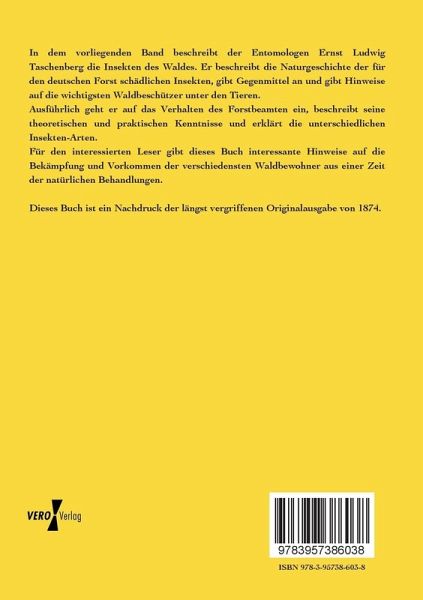 In dem vorliegenden Band beschreibt der Entomologen Ernst Ludwig Taschenberg die Insekten des Waldes. Er beschreibt die Naturgeschichte der für den deutschen Forst schädlichen Insekten, gibt Gegenmittel an und gibt Hinweise auf die wichtigsten Waldbeschützer unter den Tieren.