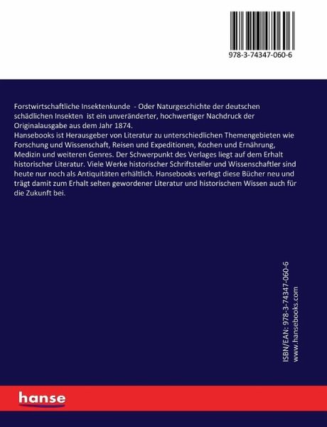 Forstwirtschaftliche Insektenkunde - Oder Naturgeschichte der deutschen schädlichen Insekten ist ein unveränderter, hochwertiger Nachdruck der Originalausgabe aus dem Jahr 1874.