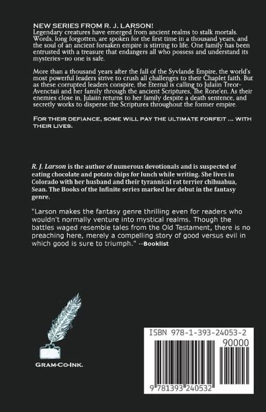 NEW SERIES FROM R. J. LARSON! Legendary creatures have emerged from ancient realms to stalk mortals. Words, long forgotten, are spoken for the first time in a thousand years, and the soul of an ancient forsaken empire is stirring to life. One family has been entrusted with a treasure that endangers all who possess and understand its mysteries-no one is safe. More than a thousand years after the fall of the Syvlande Empire, the world's most powerful leaders strive to crush all challenges to their Chaplet faith. But as these corrupted leaders conspire, the Eternal is calling to His faithful through the ancient Scriptures, The Rone'en. A devout handful of believers secretly disperses the Scriptures throughout the former empire. For their defiance, some will pay the ultimate forfeit ... with their lives.