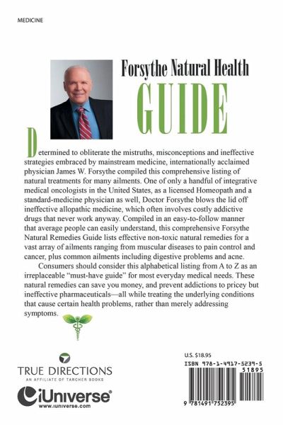 Determined to obliterate the mistruths, misconceptions and ineffective strategies embraced by mainstream medicine, internationally acclaimed physician James W. Forsythe compiled this comprehensive listing of natural treatments for many ailments. One of only a handful of integrative medical oncologists in the United States, as a licensed Homeopath and a standard-medicine physician as well, Doctor Forsythe blows the lid off ineffective allopathic medicine, which often involves costly addictive drugs that never work anyway. Compiled in an easy-to-follow manner that average people can easily understand, this comprehensive Forsythe Natural Remedies Guide lists effective non-toxic natural remedies for a vast array of ailments ranging from muscular diseases to pain control and cancer, plus common ailments including digestive problems and acne. Consumers should consider this alphabetical listing from A to Z as an irreplaceable "must-have guide" for most everyday medical needs. These natural remedies can save you money, and prevent addictions to pricy but ineffective pharmaceuticals-all while treating the underlying conditions that cause certain health problems, rather than merely addressing symptoms.