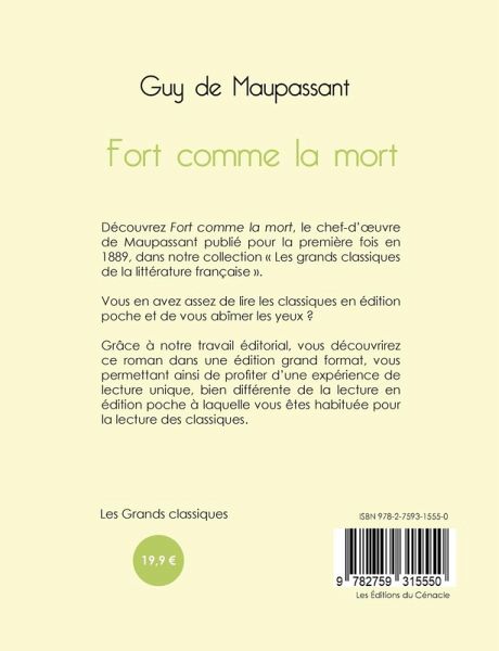 Découvrez Fort comme la mort, le chef-d¿¿uvre de Maupassant publié pour la première fois en 1889, dans notre collection « Les grands classiques de la littérature française ». Vous en avez assez de lire les classiques en édition poche et de vous abîmer les yeux ? Grâce à notre travail éditorial, vous découvrirez ce roman dans une édition grand format, vous permettant ainsi de profiter d¿une expérience de lecture unique, bien différente de la lecture en édition poche à laquelle vous êtes habituée pour la lecture des classiques.