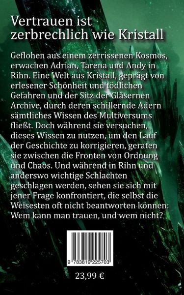 Geflohen aus einem zerrissenen Kosmos, erwachen Adrian, Tarena und Andy in Rihn. Eine Welt aus Kristall, geprägt von erlesener Schönheit und tödlichen Gefahren und der Sitz der Gläsernen Archive, durch deren schillernde Adern sämtliches Wissen des Multiversums fließt. Doch während sie versuchen, dieses Wissen zu nutzen, um den Lauf der Geschichte zu korrigieren, geraten sie zwischen die Fronten von Ordnung und Chaos. Und während in Rihn und anderswo wichtige Schlachten geschlagen werden, sehen sie sich mit jener Frage konfrontiert, die selbst die Weisesten oft nicht beantworten können: Wem kann man trauen, und wem nicht?