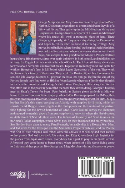 George Morpheys and Meg Tymeson come of age prior to Pearl Harbor. Discontent urges them to dream and dream they do of a life worth living They grow up in the Mid-Hudson Valley and Binghamton. George dreams of a farm of his own in Millbrook where his uncle still owns a truncated piece of land. There George got up early, ate 3 squares a day during the Depression, and hopes to return after his time at Delhi Ag College. Meg moves from Endicott where her dad, the hospitalized electrician, touched the live wire and where she comes alive in touch with boys. She escapes to her grandmother Mooer's Prospect Street house above Binghamton, starts over again unknown in high school, and publishes her writing like Reggie Levine's sci-fi in the school Oracle. The life worth living she wishes to write about her world and live that dream. Together at Delhi they meet and settle for work on Bontecott's farm in Millbrook which keeps George out of the war. They work the farm with a family of their own. They work for Bontecott, not his foreman or his son, the job George deserves till postwar the boss lets him go. Before the end of the Forties decade they find work at IBM in Poughkeepsie where as a family they flourish in the smaller house behind George's dad, Jakim Morpheys. Others sign up for the war effort and in the postwar peace find the work they dream doing. Georgie's buddies meet at Shug's Tavern for beers. Pete Pulaski as Seabee plows airfields at Midway home to his own construction company, while Eddie Rasmus prepared for D-Day, then postwar meetings as driver for Hoover, becomes postwar management for IBM. Meg's brother Keith's ship sinks crossing the Atlantic with supplies for Britain, while her Jewish friend, Reggie Levine, fights in the Phillippines and then writes of his postwar time fighting for the Jewish homeland of Israel. Carlo Kallini carries the diamonds and secured ownership papers from Antwerp back to America where the Hasid cutters on 47th Street of NYC do their work. The fathers of Kennedy and Scott families die in Anzio's Italian campaign, whose wives pick up their insurance and realty business. Son Gordon Scott plans to marry Pam Kennedy, but sadly dies in a Korean War. Mani and Jed work for the Pentagon and the Manhattan Project which will end the Pacific war. Out of West Virginia coal mines come the Groves to Wheeling and then Detroit to first preach God and then the UAW union. Son Riley Grove does flight logistics for the planes from Japan over Korea. Everybody has a part to play in the world at war. Afterward they come home to better times, when dreams of a life worth living come to fruition and they prosper like George and Meg Morpheys during the postwar peace.