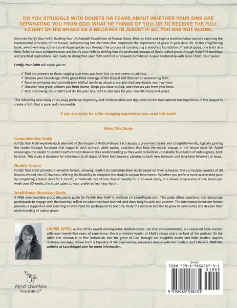 Do you struggle with doubts or fears about whether your sins are separating you from God, what He thinks of you, or to receive the full extent of His grace as a believer in Jesus? If so, you are not alone. Dive into Fortify Your Faith: Building Your Unshakable Foundation of Radical Grace, Brick by Brick and begin a transformative journey exploring the fundamental principles of the Gospel, rediscovering lost elements that emphasize the importance of grace in your daily life. In this enlightening book, award-winning author Laurel Appel guides you through the process of constructing a steadfast foundation of radical grace, one brick at a time. Enhance your comprehension and fortify your faith by delving into the profound concept of God's radical grace through insightful teachings and practical applications. Get ready to strengthen your faith and find a renewed confidence in your relationship with Jesus Christ, your Savior. Fortify Your Faith will help you to: Find the answers to those nagging questions you have that no one seems to address. Deepen your knowledge of the grace-filled message of the Gospel and discover an unwavering faith. Resolve confusing and contradictory biblical teachings about grace and shed any doubts you may have. Discover how grace delivers you from shame, keeps you close to God, and releases you from your fears. Rest in knowing Jesus didn't just die for your sins, but He also rose for your new life of joy and peace. This refreshing new study strips away pretense, hypocrisy, and condemnation and digs down to the foundational building blocks of the Gospel to create a faith that is pure and immoveable. If you are ready for a life-changing experience, you need this book!