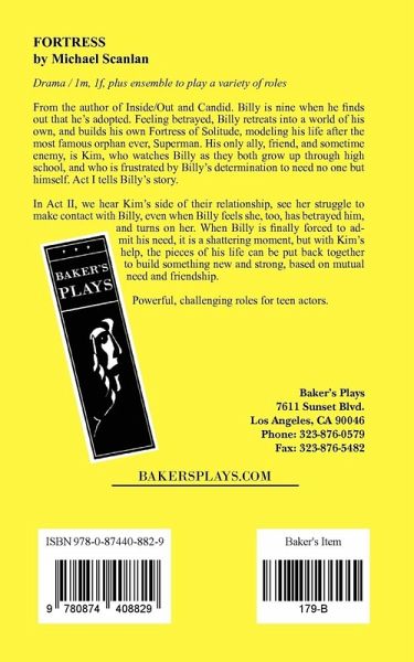Drama / Characters: 1 male, 1 female, plus ensemble of a variety of roles Billy is nine when he finds out, accidentally, that he's adopted. Feeling betrayed, he retreats into a world of his own, cuts his mother and father off completely and builds up his own Fortress of Solitude, modeling his life after that of the most famous orphan ever, Superman. His only ally, friend and sometimes enemy, is Kim, who watches Billy as they both grow through high school, and who is frustrated by Billy's deter