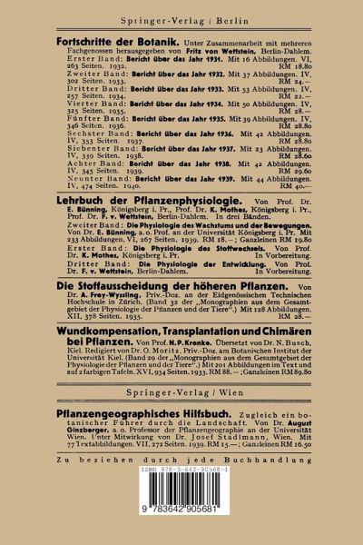 A. Morphologie.- 1. Morphologie und Entwicklungsgeschichte der Zelle.- 2. Morphologie einschließlich Anatomie.- 3. Entwicklungsgeschichte und Fortpflanzung.- B. Systemlehre und Stammesgeschichte.- 4. Systematik.- 5. Paläobotanik.- 6. Systematische und genetische Pflanzengeographie.- C. Physiologie des Stoffwechsels.- 7. Physikalisch-chemische Grundlagen der biologischen Vorgänge.- 8. Zellphysiologie und Protoplasmatik.- 9. Wasserumsatz und Stoffbewegungen..- 10. Mineralstoffwechsel.- 11. Stoffwechsel organischer Verbindungen I (Photosynthese1).- 12. Stoffwechsel organischer Verbindungen II.- 13. Ökologische Pflanzengeographie.- D. Physiologie der Organbildung.- 14. Vererbung.- 15. Zytogenetik.- 16. Wachstum und Bewegung.- 17. Entwicklungsphysiologie.- E. Ökologie.- 18. Blütenbiologie, Symbiosen u. a..