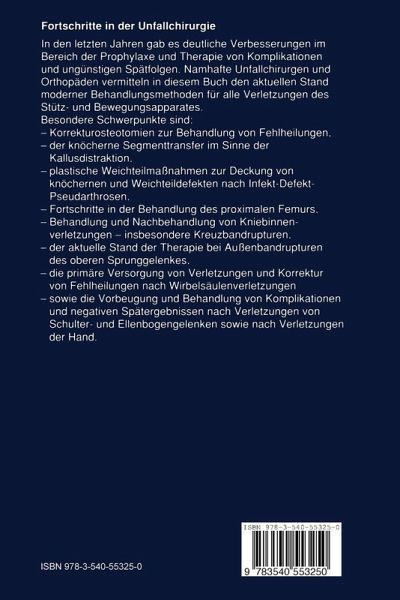 A Unter- und Oberschenkel.- 1. Fehlheilungen und Heilungsstörungen.- Die Therapie und wachstumsabhängige Korrekturmöglichkeit der Achse bei kindlichen Oberschenkelschaftfrakturen.- Bogenförmige Tibiakopfosteotomie.- Die Korrektur posttraumatischer intraartikulärer Fehlstellungen am Knie- und Sprunggelenk.- Korrekturosteotomien und ihre Ergebnisse bei kniegelenknahen posttraumatischen Fehlstellungen.- Sekundäre Marknagelung der Tibia bei gestörter Knochenbruchheilung nach Fixateur-externe-Osteosynthesen.- Komplikationen nach operativer Versorgung von 146 Pseudoarthrosen langer Röhrenknochen.- Der Verriegelungsnagel in der Behandlung von Bruchheilungsstörungen an Femur und Tibia.- 2. Die Behandlung von Knochen- und Weichteildefekten - Prophylaxe und Therapie von Infekten.- Die Pathophysiologie der Knochenbruchheilung.- Komplikationen und Risiken bei der Epiphysenfugen- und Kallusdistraktion der unteren Extremitäten mit dem Wiesbadener Ringfixateur.- Der Einsatz der Distraktionskortikotomie bei posttraumatischen Fehlstellungen und Knochendefekten.- Vorteile der Segmentverschiebung bei der Therapie von infizierten Pseud- und Defektpseudarthrosen.- Die Segmentverschiebung bei der posttraumatischen Osteitis.- Schwerer Knochen- und Weichteilschaden: Bedeutung für posttraumatische Infektionen und Therapiekonzepte.- Wandel des Therapiekonzeptes bei offenen Unterschenkelfrakturen zur Prophylaxe posttraumatischer Osteitiden.- Die Bedeutung des Weichteilschadens für die postoperative Infektion.- Gestielte und freie Muskellappenplastik zur Prävention von Infektionen des Knochengewebes bei frischen Verletzungen und nach selektiven Eingriffen an der unteren Extremität.- Modernes Management der hochgradigen Unterschenkelfraktur und ihrer Folgen zum Aufbau vonWeichteilen und Knochen.- Die septische Pseudarthrose - Behandlungskonzept und Ergebnisse.- B Proximales Femur, Hüftgelenk, Becken.- C Kniegelenk.- D Oberes und unteres Sprunggelenk.- E Wirbelsäule.- F Schultergelenk und Oberarm.- G Ellenbogengelenk und Unterarm.- H Hand.