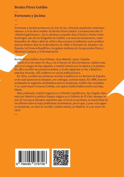 Fortunata y Jacinta pertenece al ciclo de las Novelas españolas contemporáneas y es la obra cumbre de Galdós. La trama describe el Madrid galdosiano. Así lo afirman Leopoldo Alas (Clarín) y Pedro Ortiz-Armengol, uno de los biógrafos de Galdós. Los sucesos transcurren, entre diciembre de 1869 y abril de 1876 y diseccionan el ambiente socio-político tras los últimos días de la Revolución de 1868, el Reinado de Amadeo I de España, la Primera República, los golpes militares de los generales Pavia y Martínez Campos, y la Restauración. En esta cuarta parte Fortunata es preñada por el Delfín y protegida por el farmaceútico Segismundo Ballester. Fortunata morirá tras dar a luz un niño, que, moribunda, entregará a Jacinta.