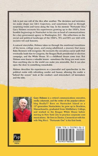 Life is just one roll of the dice after another. The decisions and mistakes we make shape our life's trajectory, and sometimes lead us through surprising twists and turns along the way. In his memoir "Fortunate One," Gary Holmes recounts his experiences growing up in the 1950's, from humble beginnings in Nantucket to his rise as head of communications for a key government agency in Washington, D.C. His reflections on the social and political landscape of the 1960's, 70's and 80's are told with incisive wit and honesty. A natural storyteller, Holmes takes us through the emotional transitions of his teens, college years, and young adulthood, a journey that many Baby Boomers will recognize. He recounts the circuitous career path that eventually leads him to Congress, the Reagan/Bush presidential re-election campaign, and the- White House. It's a 'childhood dream come true. But Holmes soon learns a valuable lesson: sometimes the thing you want more than anything else in the world can make you miserable. But it can also open the door to something remarkable. Holmes describes his experiences as a journalist and speechwriter in the political realm with refreshing candor. and humor, allowing the reader a ''behind the scenes" look at the conduct -- and misconduct -- of lawmakers and the elite.