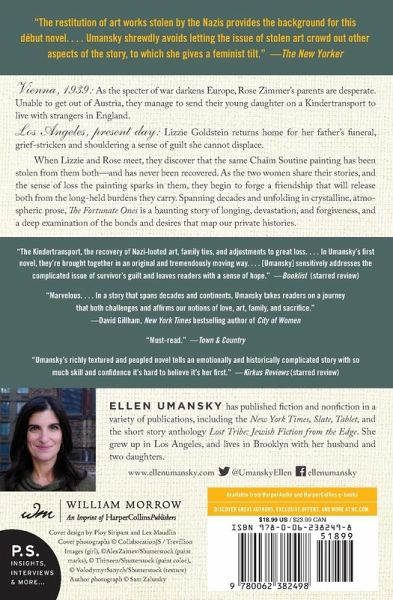 Vienna, 1939: As the specter of war darkens Europe, Rose Zimmer’s parents are desperate. Unable to get out of Austria, they manage to send their young daughter on a Kindertransport to live with strangers in England. Los Angeles, present day: Lizzie Goldstein returns home for her father’s funeral, grief-stricken and shouldering a sense of guilt she cannot displace. When Lizzie and Rose meet, they discover that the same Chaim Soutine painting has been stolen from them both—and has never been recovered. As the two women share their stories, and the sense of loss the painting sparks in them, they begin to forge a friendship that will release both from the long-held burdens they carry. Spanning decades and unfolding in crystalline, atmospheric prose, The Fortunate Ones is a haunting story of longing, devastation, and forgiveness, and a deep examination of the bonds and desires that map our private histories.