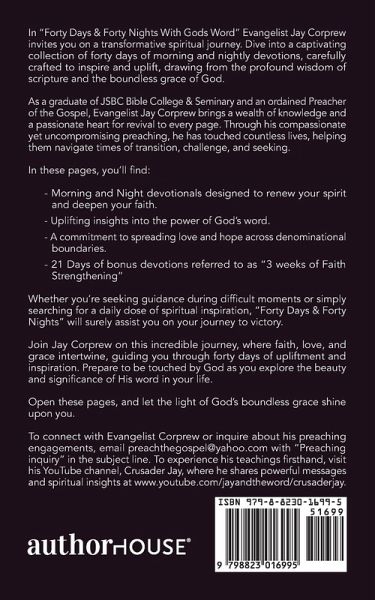 In "Forty Days & Forty Nights With Gods Word" Evangelist Jay Corprew invites you on a transformative spiritual journey. Dive into a captivating collection of forty days of morning and nightly devotions, carefully crafted to inspire and uplift, drawing from the profound wisdom of scripture and the boundless grace of God. As a graduate of JSBC Bible College & Seminary and an ordained Preacher of the Gospel, Evangelist Jay Corprew brings a wealth of knowledge and a passionate heart for revival to every page. Through his compassionate yet uncompromising preaching, he has touched countless lives, helping them navigate times of transition, challenge, and seeking. In these pages, you'll find: - Morning and Night devotionals designed to renew your spirit and deepen your faith. - Uplifting insights into the power of God's word. - A commitment to spreading love and hope across denominational boundaries. - 21 Days of bonus devotions referred to as "3 weeks of Faith Strengthening" Whether you're seeking guidance during difficult moments or simply searching for a daily dose of spiritual inspiration, "Forty Days & Forty Nights" will surely assist you on your journey to victory. Join Jay Corprew on this incredible journey, where faith, love, and grace intertwine, guiding you through forty days of upliftment and inspiration. Prepare to be touched by God as you explore the beauty and significance of His word in your life. Open these pages, and let the light of God's boundless grace shine upon you. To connect with Evangelist Corprew or inquire about his preaching engagements, email preachthegospel@yahoo.com with "Preaching inquiry" in the subject line. To experience his teachings firsthand, visit his YouTube channel, Crusader Jay, where he shares powerful messages and spiritual insights at www.youtube.com/jayandtheword/crusaderjay.