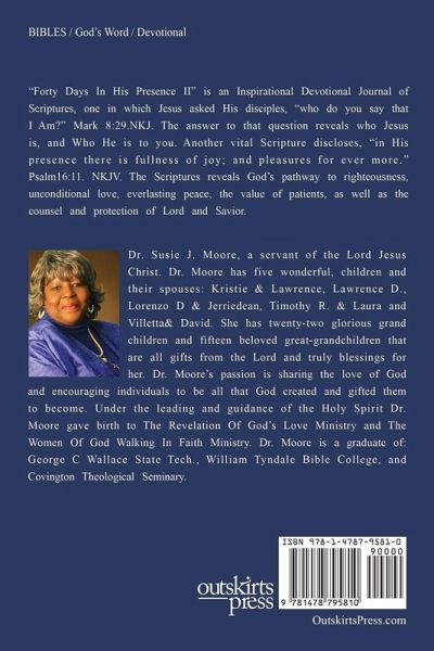 "Forty Days In His Presence II" is an Inspirational Devotional Journal of Scriptures, one in which Jesus asked His disciples, "who do you say that I Am?" Mark 8:29.NKJ. The answer to that question reveals who Jesus is, and Who He is to you. Another vital Scripture discloses, "in His presence there is fullness of joy; and pleasures for ever more." Psalm16:11. NKJV. The Scriptures reveals God's pathway to righteousness, unconditional love, everlasting peace, the value of patients, as well as the counsel and protection of Lord and Savior.