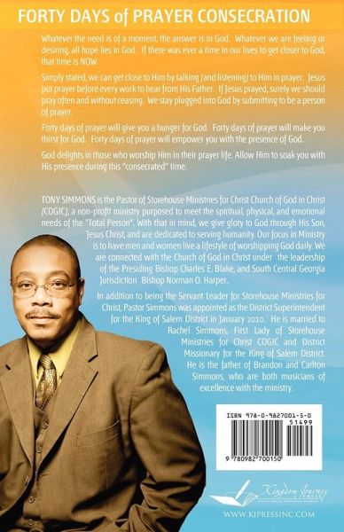 Whatever the need is of a moment, the answer is in God. Whatever we are feeling or desiring, all hope lies in God. If there was ever a time in our lives to get closer to God, that time is NOW. Forty days of prayer will give you a hunger for God. Forty days of prayer will make you thirst for God. Forty days of prayer will empower you with the presence of God. God delights in those who worship Him in their prayer life. Allow Him to soak you with His presence during this "consecrated" time.