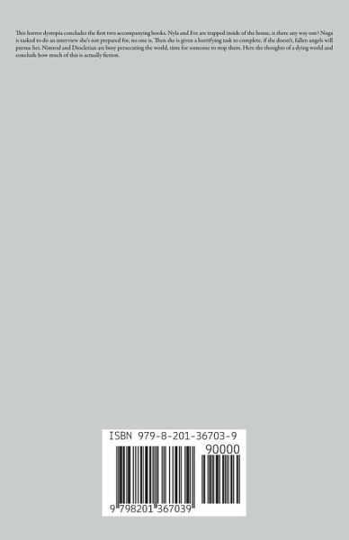 This horror dystopia concludes the first two accompanying books. Nyla and Eve are trapped inside of the house, is there any way out? Noga is tasked to do an interview she's not prepared for, no one is. Then she is given a horrifying task to complete, if she doesn't, fallen angels will pursue her. Nimrod and Diocletian are busy persecuting the world, time for someone to stop them. Here the thoughts of a dying world and conclude how much of this is actually fiction.