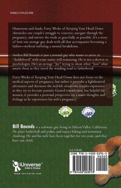 Humorous and frank, Forty Weeks of Keeping Your Head Down chronicles one couple's struggle to conceive, navigate through the pregnancy, and survive the trials as gracefully as possible. It's a story of how one average guy deals with all that accompanies becoming a father-without suffering a mental breakdown. Author Bill Bounds is just a normal guy who wants to arrive at "daddyhood" with some sanity still remaining. He is not a doctor or psychologist. He's an average "Joe" trying to show others "Joes" what awaits them as they travel the winding road to fatherhood. Forty Weeks of Keeping Your Head Down does not focus on the medical aspects of pregnancy, but rather it provides a lighthearted alternative and discusses the real-life situations couples experience as they try to become parents. Geared toward men, but helpful for women, it provides a personal perspective on a man's thoughts and feelings as he experiences his wife's pregnancy.
